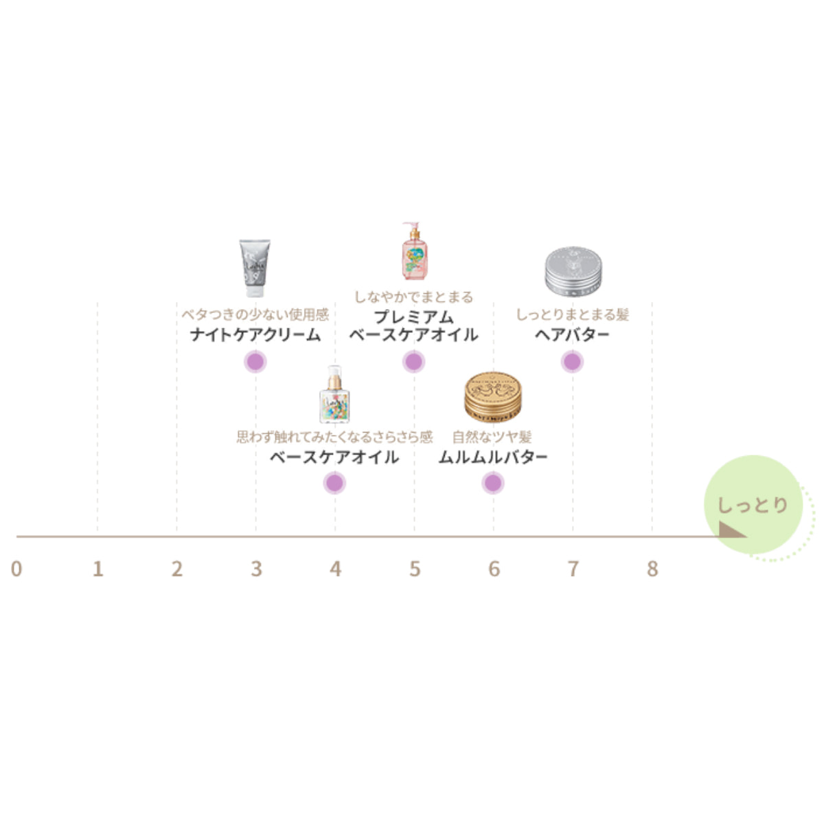 夜、寝る前につけると翌朝しっとり!ベタつきが少なく、しっとりしすぎない使用感で寝グセがつきにくく、簡単に手ぐしで髪がまとまります。