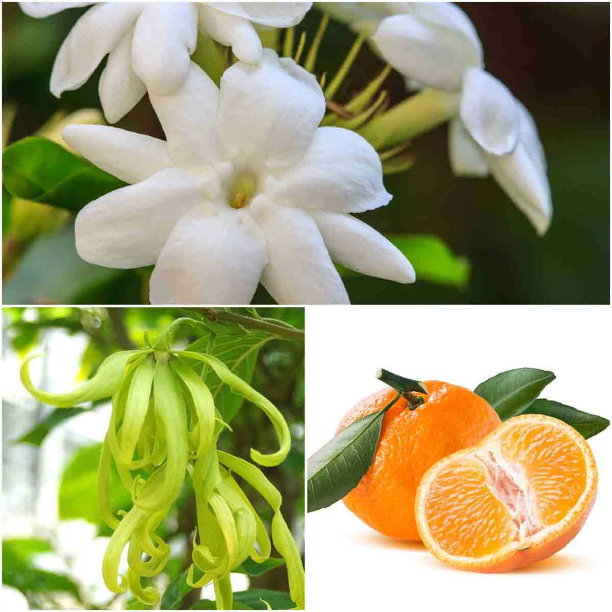 ジャスミンabs精油、マンダリン精油、レモン精油、イランイラン精油、パチュリ精油