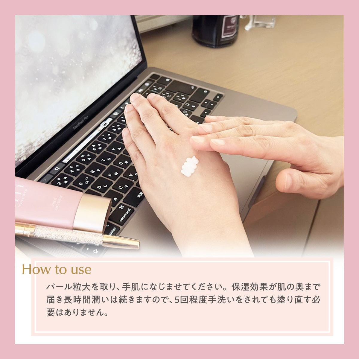 保水力にも優れ、塗った後に手を洗っても手の潤いを保ち続けます。