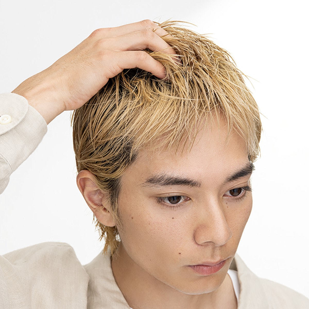 全体になじませた後、タイトにしたい部分は手で軽く抑え、立体感の欲しい部分は持ち上げるイメージで数秒キープさせます。