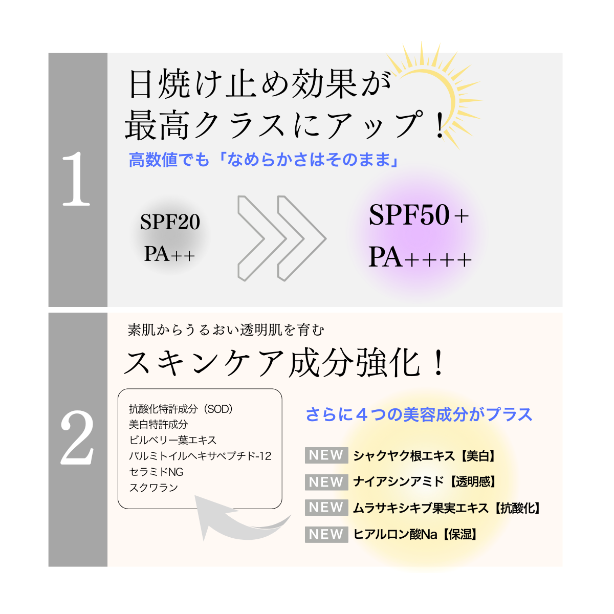 水、シクロペンタシロキサン、BG、パルミチン酸エチルヘキシル、トリエチルヘキサノイン、PEG-10ジメチコン、グリセリン、(HDI/トリメチロールヘキシルラクトン)クロスポリマー、ステアリン酸亜鉛、トリメチルシロキシケイ酸、スクワラン、セラミドNG、パルミトイルヘキサペプチド-12、スーパーオキシドジスムターゼ、ウワウルシ葉エキス、リン酸アスコルビルMg、ビルベリー葉エキス、マカデミア種子油、トコフェロール、グリチルリチン酸2K、ダイマージリノール酸水添ヒマシ油、イソステアリン酸、クエン酸Na、トリイソステアリン酸ポリグリセリル-2、ペンチレングリコール、オクチルドデカノール、炭酸Ca、エチルヘキシルグリセリン、シリカ、ジメチコン、ジステアルジモニウムヘクトライト、アルミナ、(ジメチコン/ビニルジメチコン)クロスポリマー、乳酸、PEG-10フィトステロール、トリベヘニン、安息香酸アルキル(C12-15)、フェノキシエタノール、酸化チタン、タルク、マイカ、酸化鉄、酸化スズ
