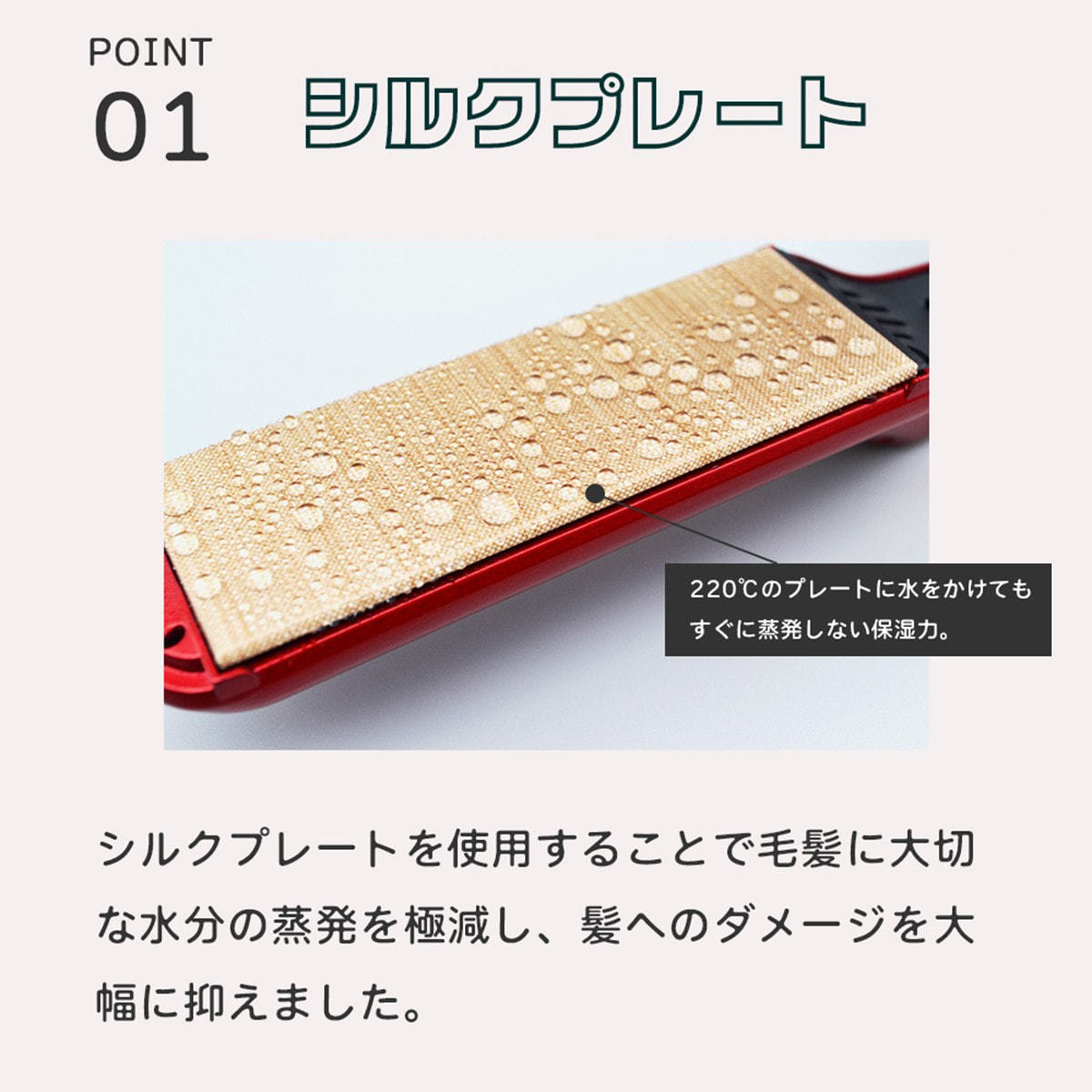 「シルクプレート」のみを搭載しているものや「センサーレス機能」のみを搭載しているアイロンは今までにも存在しましたが、このアイロンにはその両方が搭載されています。両方が搭載されているからこそ温度の安定感が高く、早い施術を可能にし、髪への負担を少なく、ヘアデザインすることが可能となります。