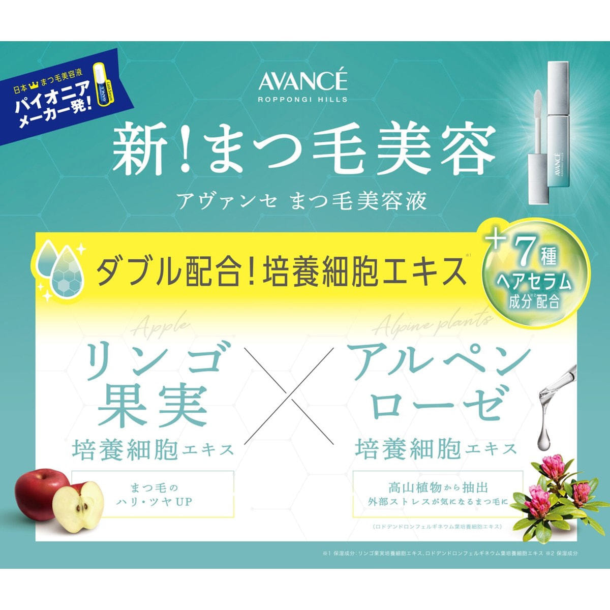 ダブル培養細胞エキス※1と7種類のヘアセラム成分※2が配合されているため、まつ毛だけでなく、