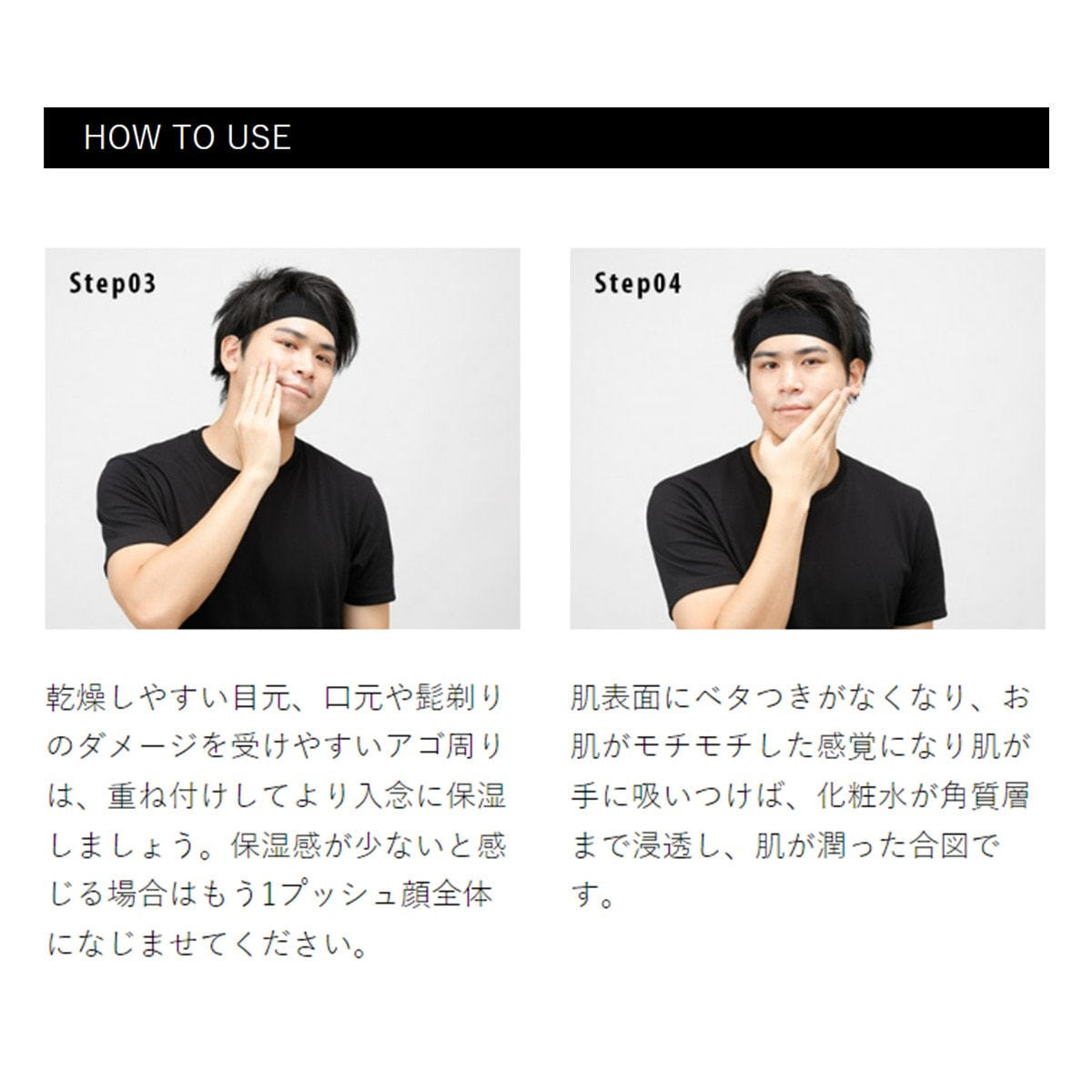 ③乾燥しやすい目元、口元や髭剃りのダメージを受けやすいアゴ周りは、重ね付けしてより入念に保湿しましょう。保湿感が少ないと感じる場合はもう1プッシュ顔全体になじませてください。