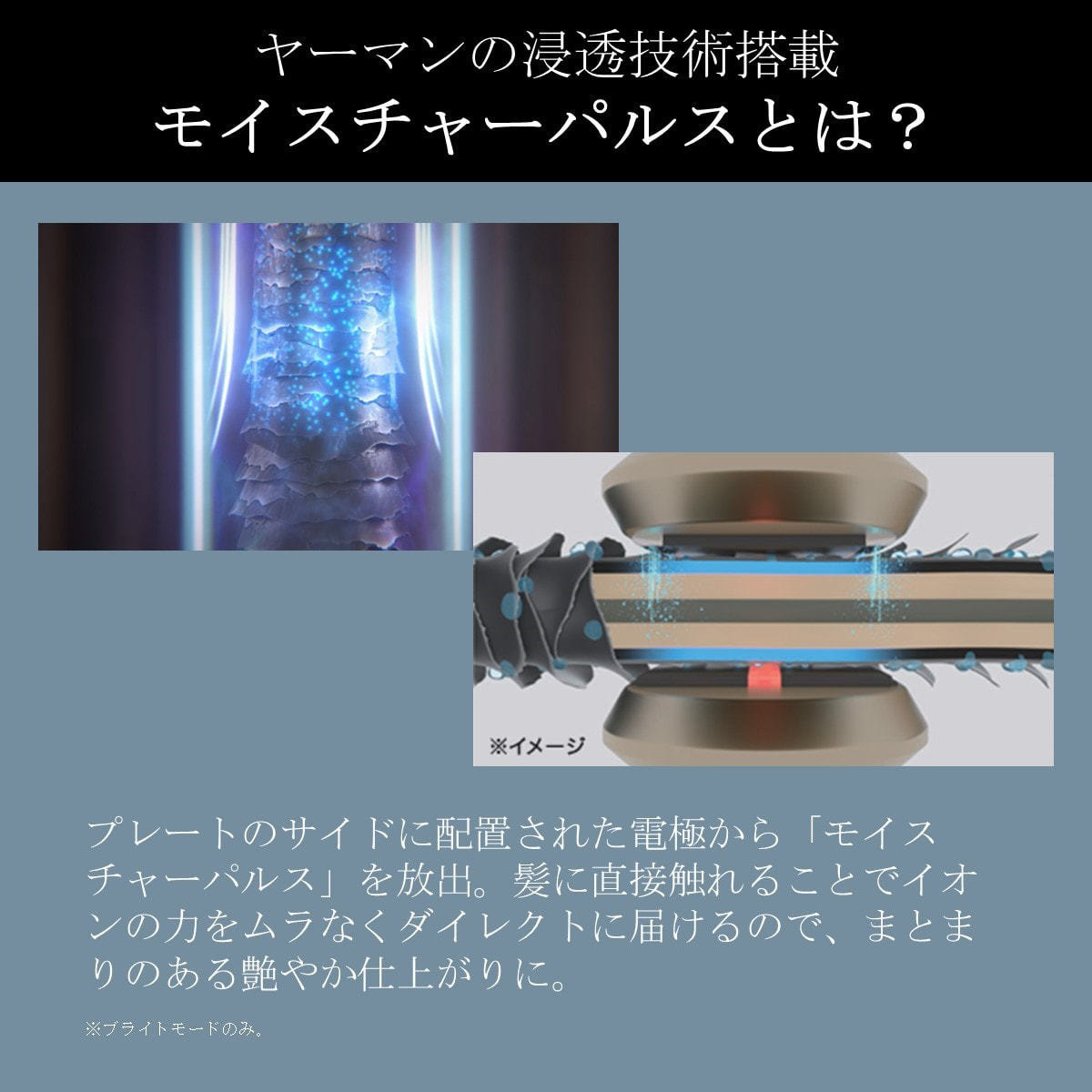 ※ブライトモード稼働時にイオン電極が髪に直接触れてアプローチします。