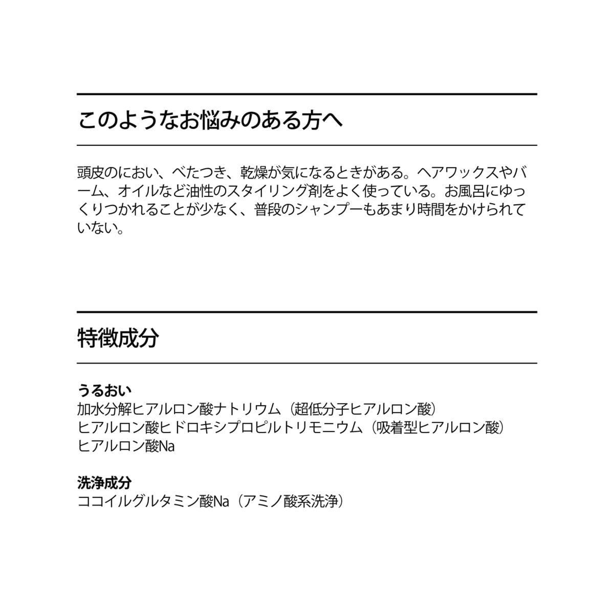 肌にやさしく保湿⼒の⾼いアミノ酸系洗浄剤をベースに、コラーゲン代謝を活性化する超低分⼦ヒアルロン酸、頭⽪や⽑髪に吸着して潤いを与える吸着型ヒアルロン酸など、3つの異なるヒアルロン酸を配合。