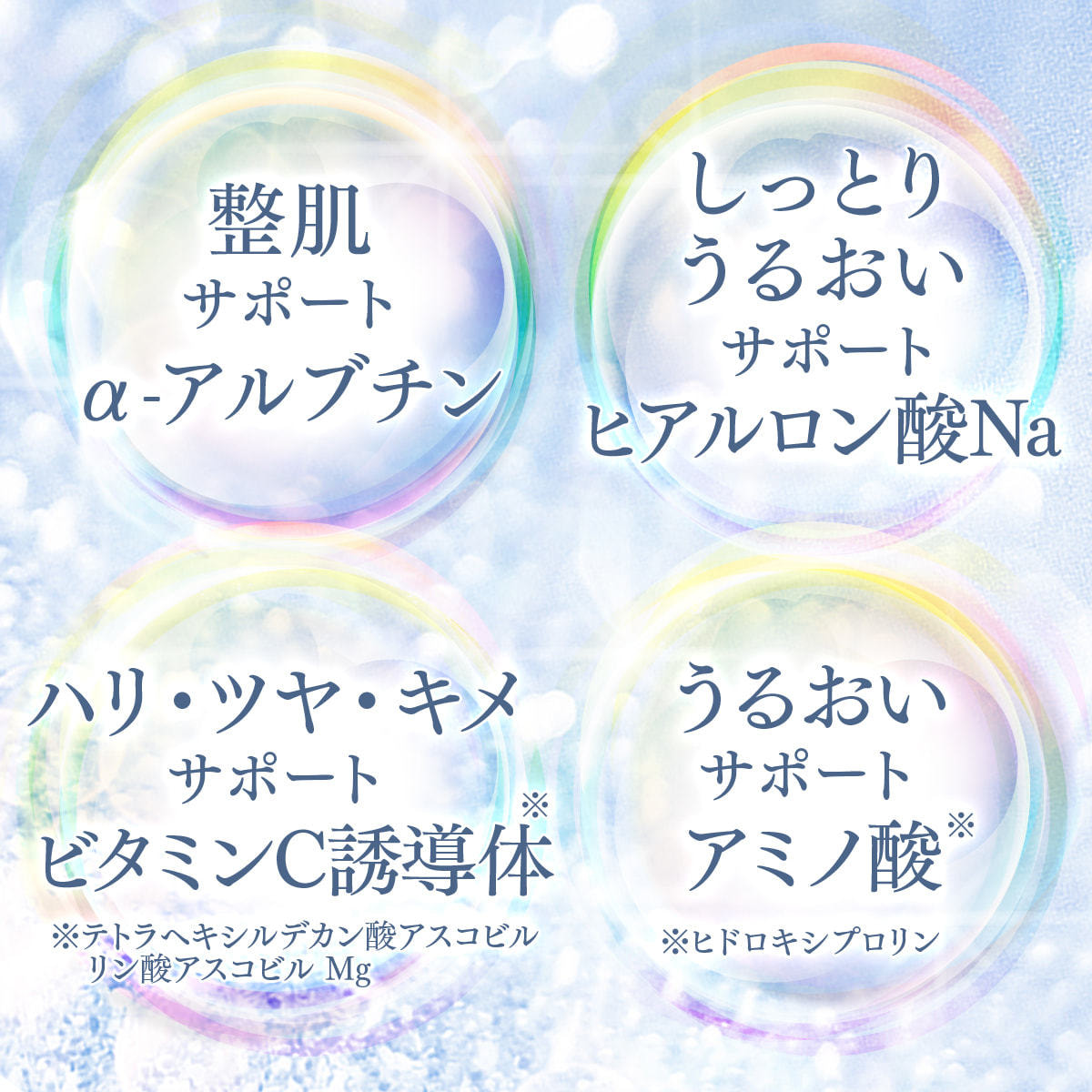 水、BG、グリセリン、ジグリセリン、LPG、セテアリルアルコール、PEG-25フィトスタノール、ベベン酸、ステアリン酸、TEA、ベヘニルアルコール、二酸化炭素、PEG-150、ヒアルロン酸Na、α-アルブチン、ヒドロキシプロリン、テトラヘキシルデカン酸アスコルビル、リン酸アスコルビルMg、グレープフルーツ果皮油、フェノキシエタノール