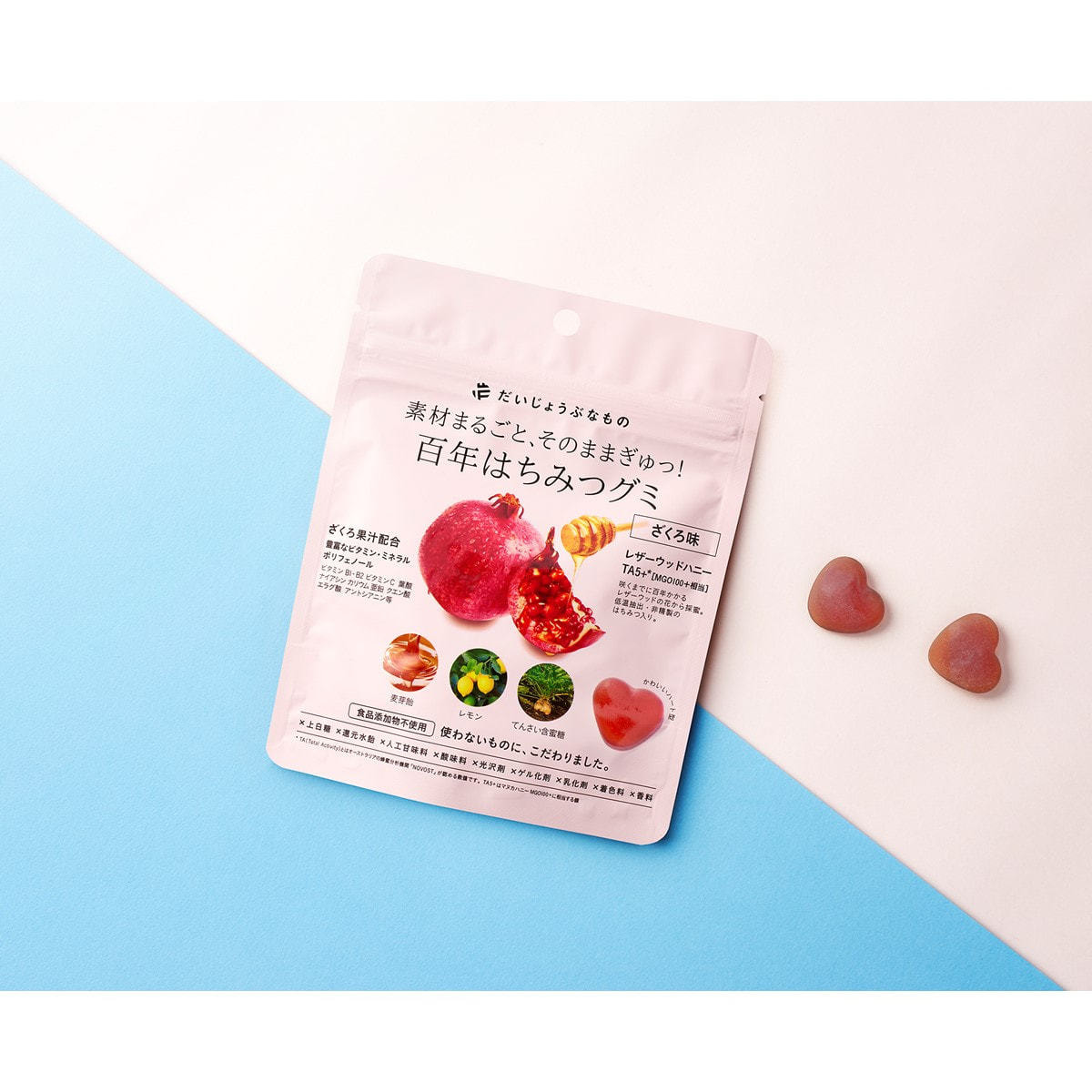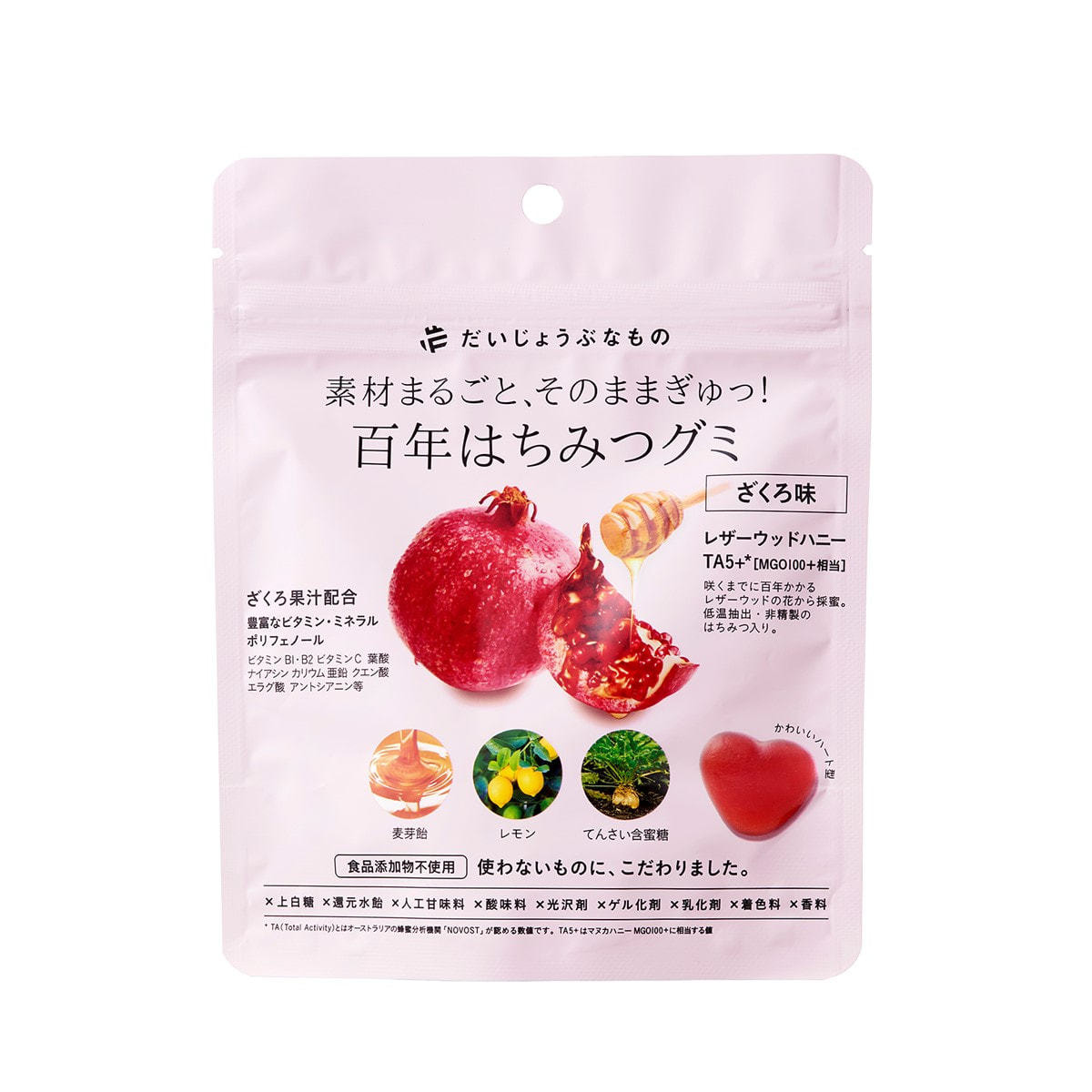 商品名:だいじょうぶなもの 百年はちみつグミ ざくろ味 49g