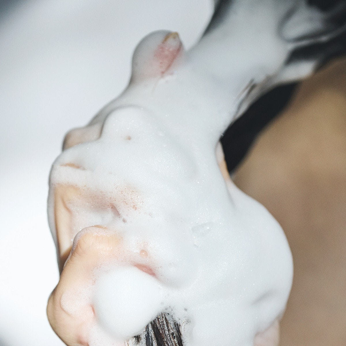 ケア成分を豊富に含んだ泡で髪を包み込みます。よりしっとり潤いのある仕上がりに。