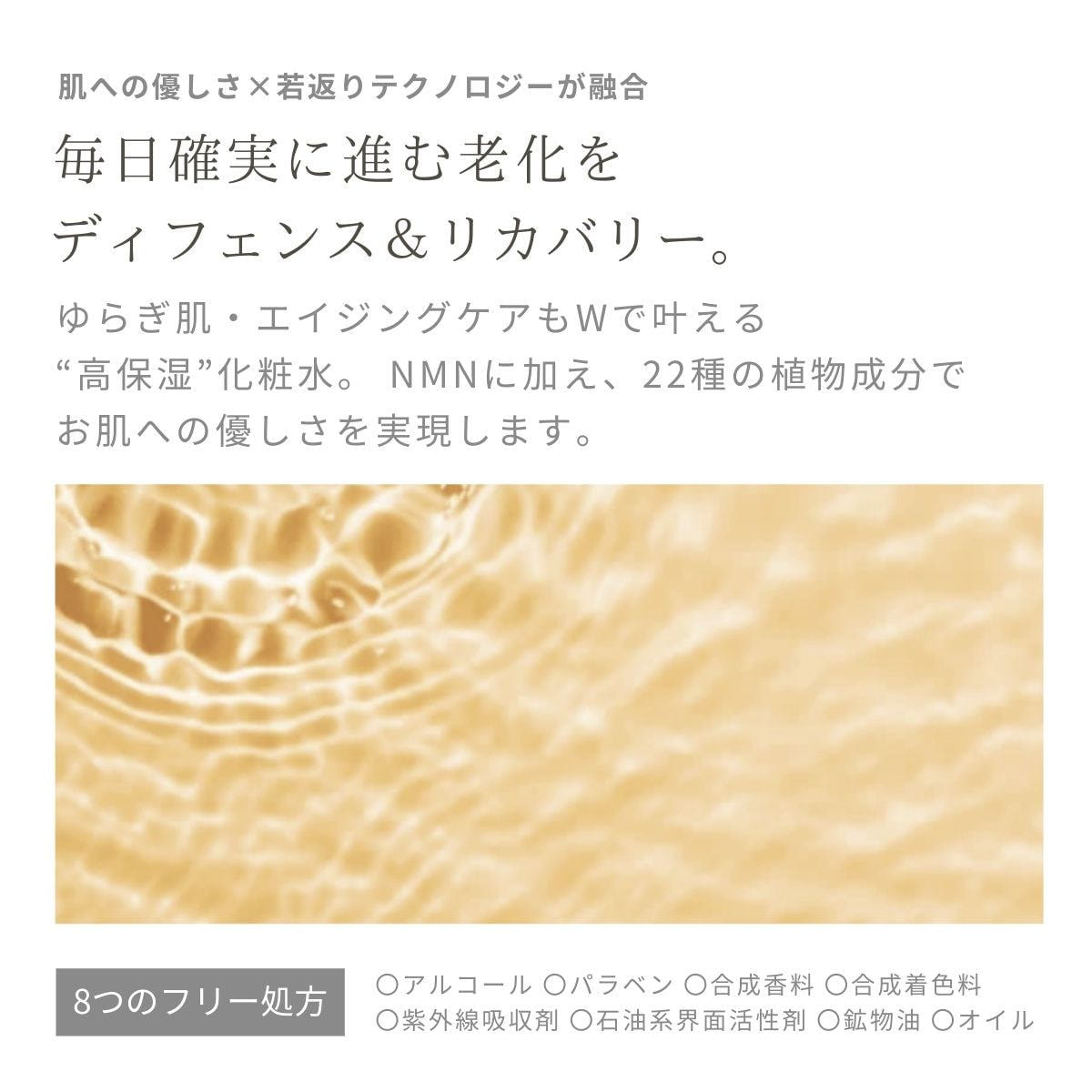 水、BG、ペンチレングリコール、ニコチンアミドモノヌクレオチド、ナイアシンアミド、乳酸桿菌、シソ葉エキス、グリチルリチン酸2K、カンゾウ根エキス、カエサルピニアスピノサ果実エキス,、カッパフィカスアルバレジエキス、カミツレ花エキス、イチョウ葉エキス、ハマメリス葉エキス、アシタバ葉/茎エキス、キハダ樹皮エキス、レモン果実エキス、オタネニンジン根エキス、ローズマリー葉エキス、セイヨウトチノキ種子エキス、アルニカ花エキス、ボタンエキス、オウゴン根エキス、トウキンセンカ花エキス、ローマカミツレ花エキス、チャ葉エキス、セイヨウオオバコ種子エキス、アー+