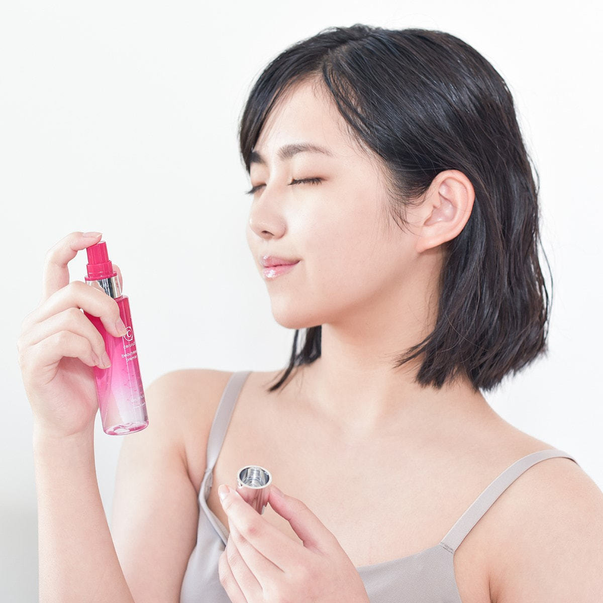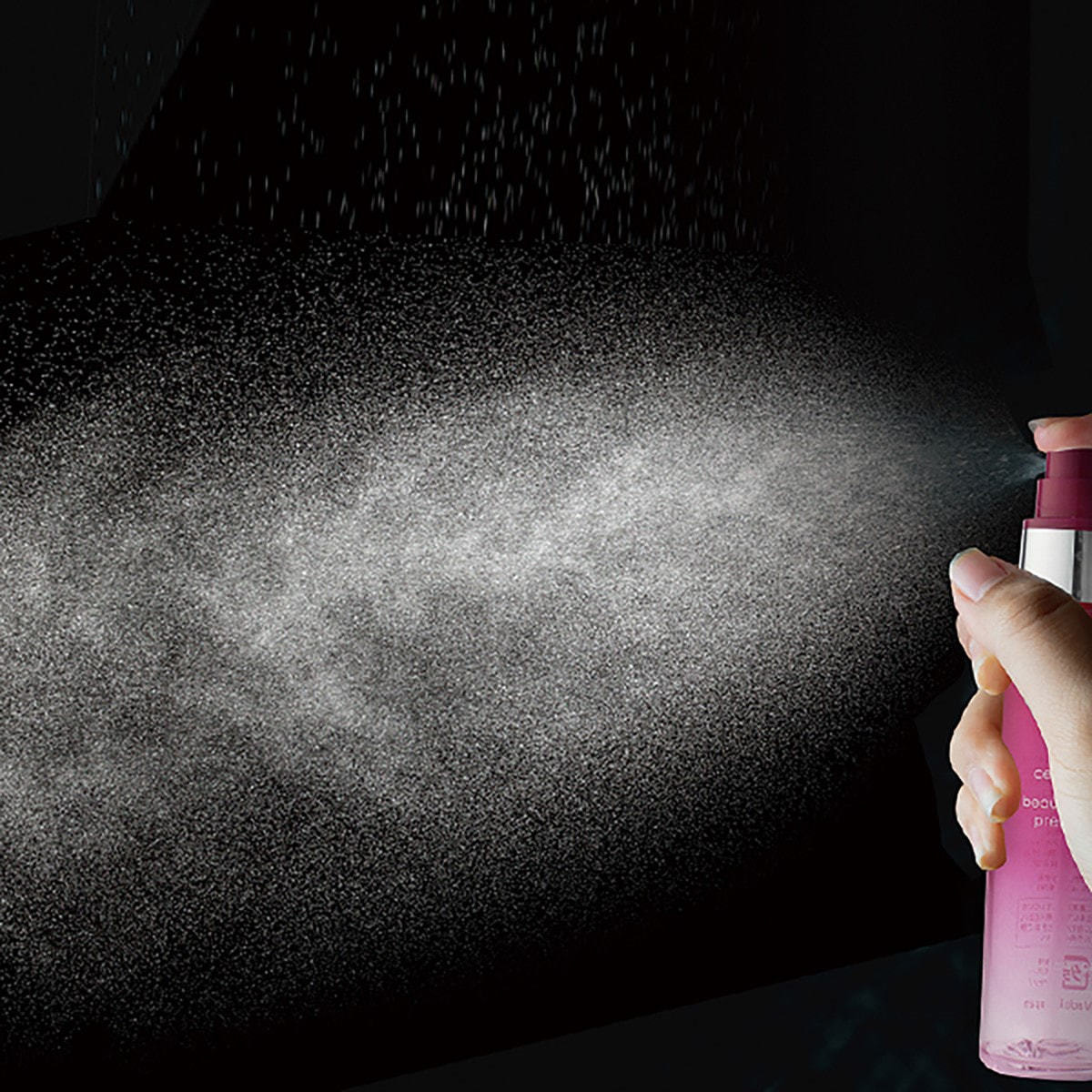 メイク後の仕上げに顔から15cmほどはなし目と口を閉じて、顔全体にムラなく噴射します。
