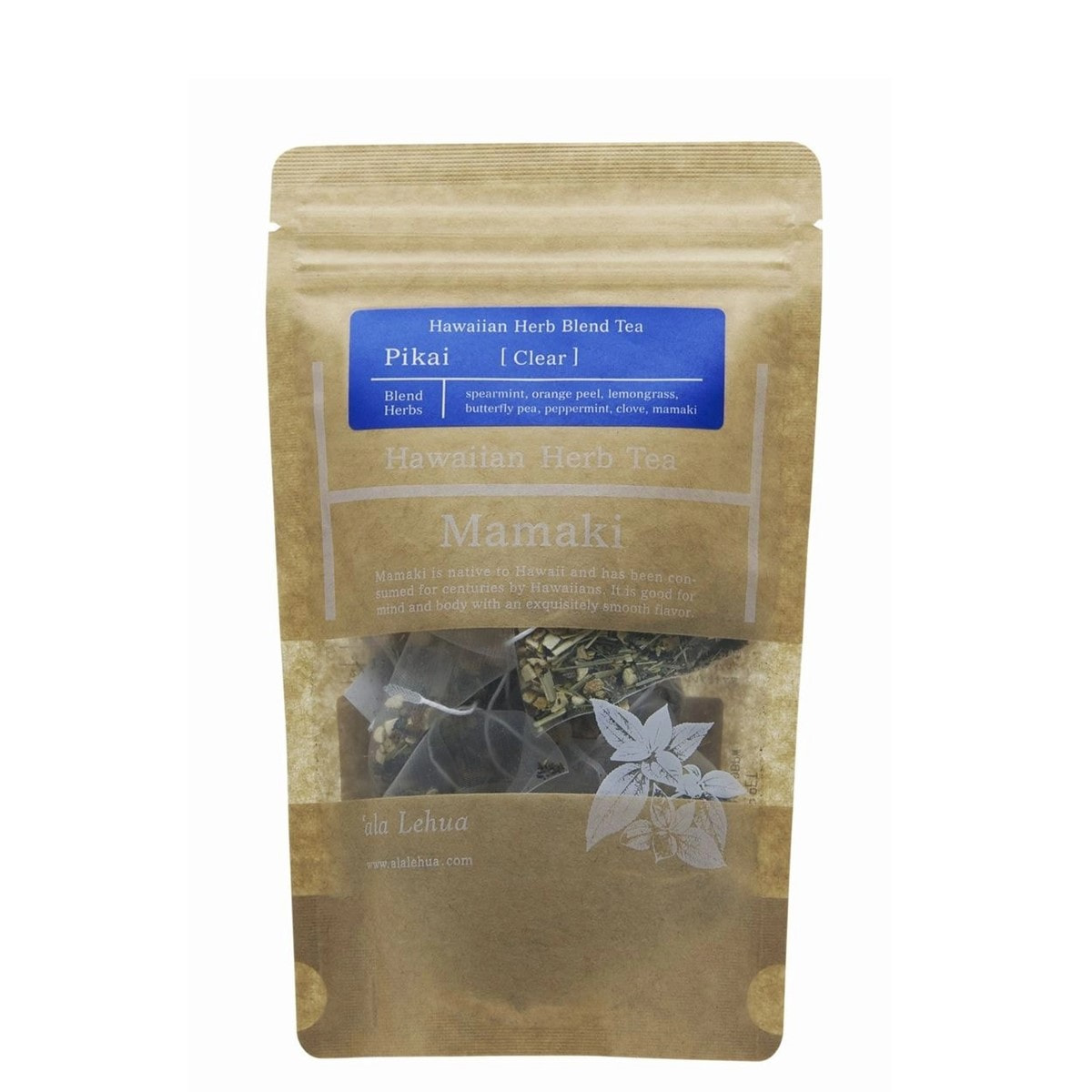 ハワイアンハーブのママキと世界各地のハーブをブレンドしたハーブティーで自然のティーカラーが特徴です。