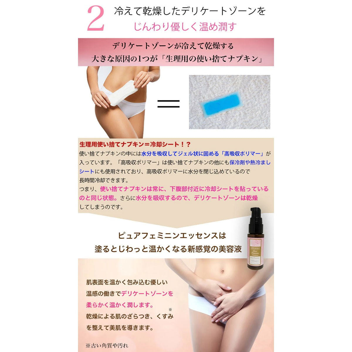 塗るとじわっと温かくなる新感覚の美容液。デリケートゾーンを柔らかく温かく潤します。