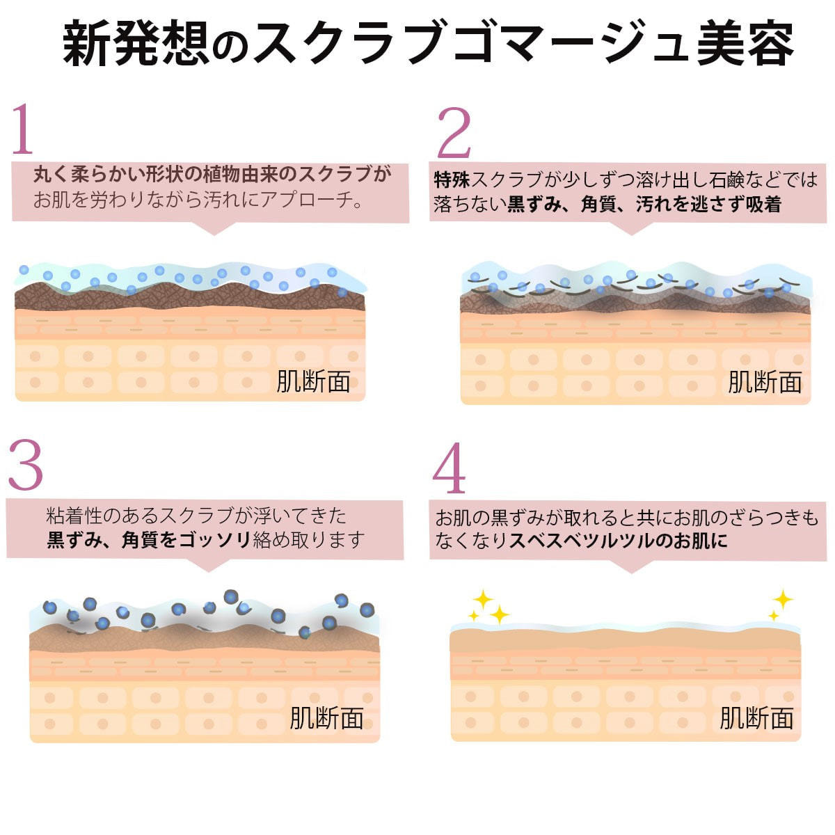 ③スクラブは洗い流してください。お風呂上りにご使用のクリームや美容液を塗るとより効果的です。