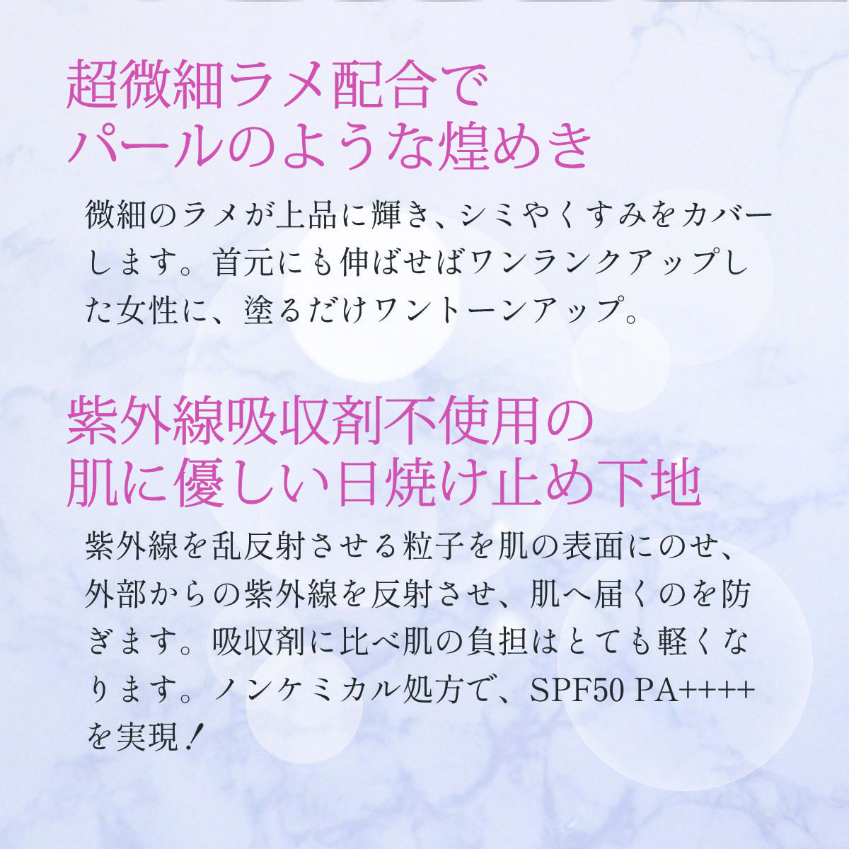 シクロペンタシロキサン、酸化亜鉛、酸化チタン、水、BG、ジメチコン、ポリグリセリル‐3ポリジメチルシロキシエチルジメチコン、イソノナン酸イソトリデシル、(ハイドロゲンジメチコン/オクチルシルセスキオキサン)コポリマー、シリカ、(ジメチコン/(PEG‐10/15))クロスポリマー、α‐アルブチン、リン酸アスコルビルMg、グリチルリチン酸2K、コメ発酵液、イワベンケイ根エキス、アセチルヒアルロン酸Na、コメヌカスフィンゴ糖脂質、コメヌカ油、オタネニンジン根エキス、クズ根エキス、アロエベラ葉エキス、クロレラエキス、オウゴン根エキス、カワラヨモギ花エキス、カンゾウ根エキス、マグワ根皮エキス、ナツメ果実エキス、サンザシエキス、グレープフルーツ果実エキス、リンゴ果実エキス、オレンジ果汁、レモン果汁、ライム果汁、グリセリン、レシチン、オレイン酸ポリグリセリル‐10、クオタニウム‐18ヘクトライト、(加水分解シルク/PGプロピルメチルシランジオール)クロスポリマー、(アクリレーツ/アクリル酸アルキル(C10‐30))クロスポリマー、(ビニルジメチコン/メチコンシルセスキオキサン)クロスポリマー、(ジメチコン/ビニルジメチコン)クロスポリマー、塩化Na、クエン酸Na、水酸化Na、水酸化Al、ホウケイ酸(Ca/Al)、フェノキシエタノール