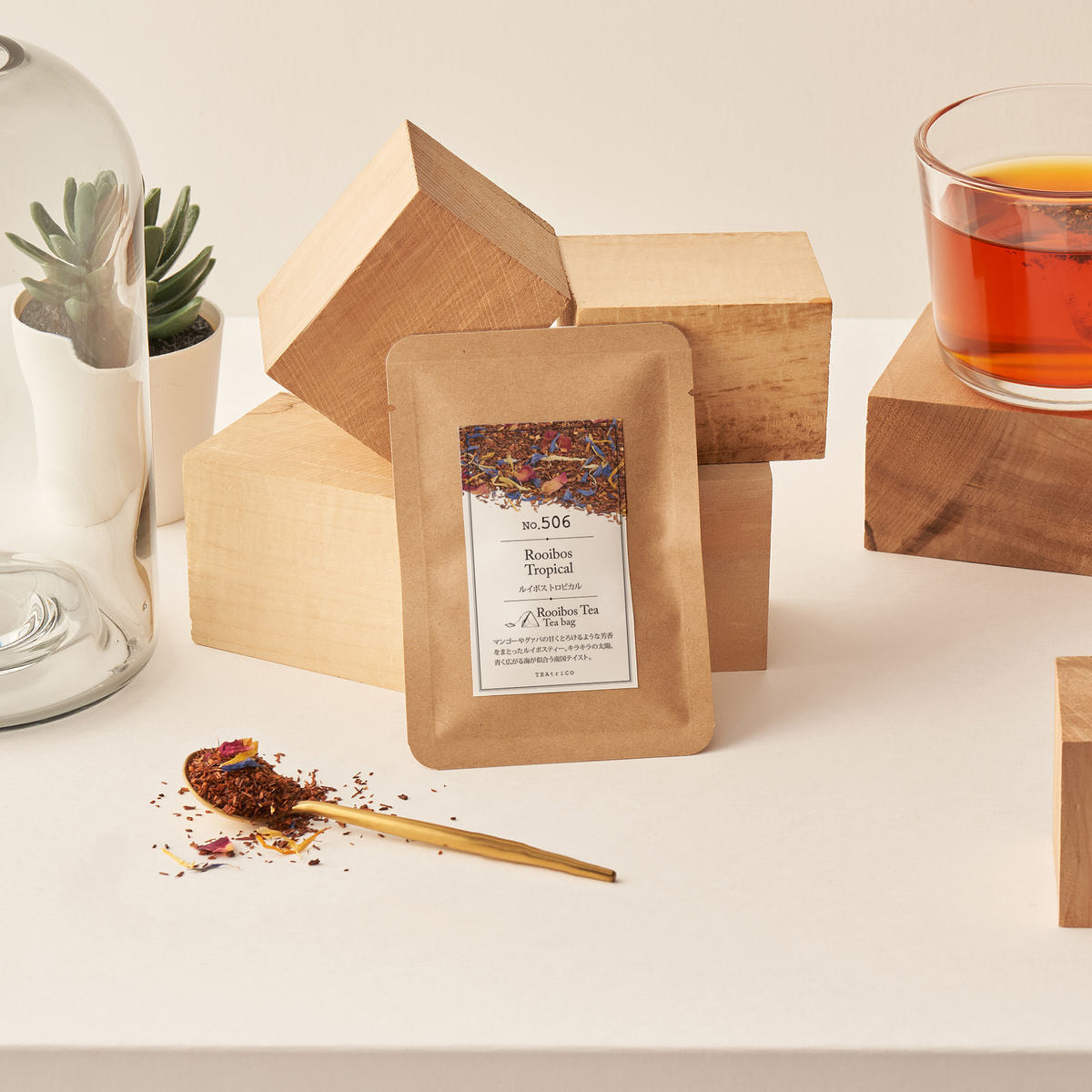 レッドルイボスの優しい甘みをベースに、トロピカルフルーツの魅惑的な香りをブレンドした、心躍る一杯です。
