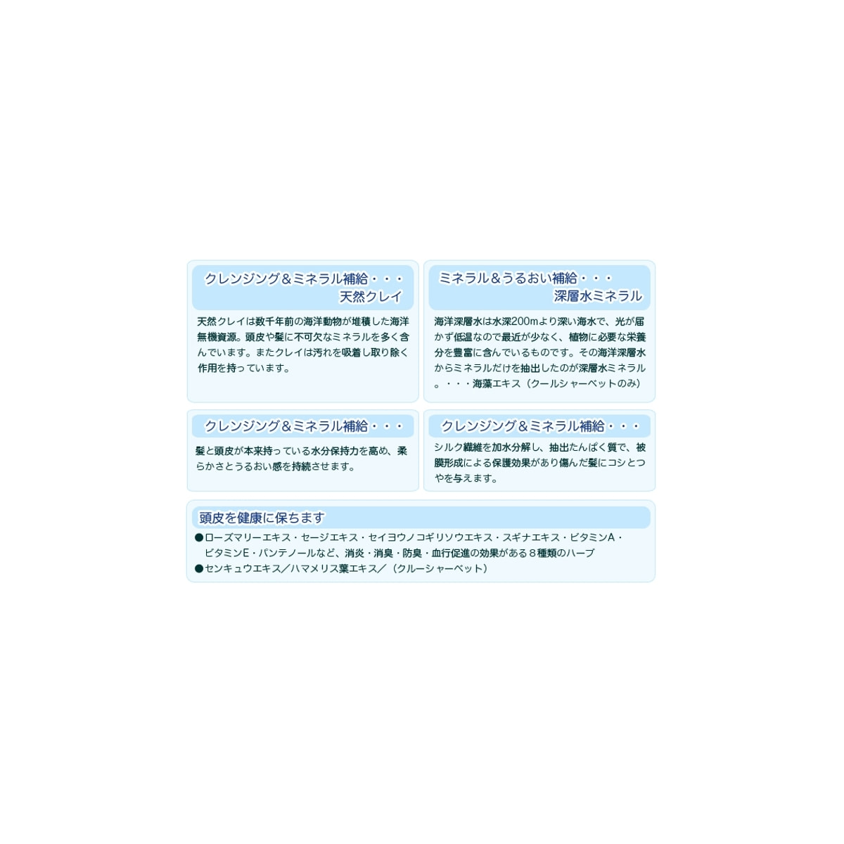 天然クレイとアミノ酸系洗浄成分が、頭皮や髪の汚れをやさしく取り除き、しっとりなめらかな洗い上がり。