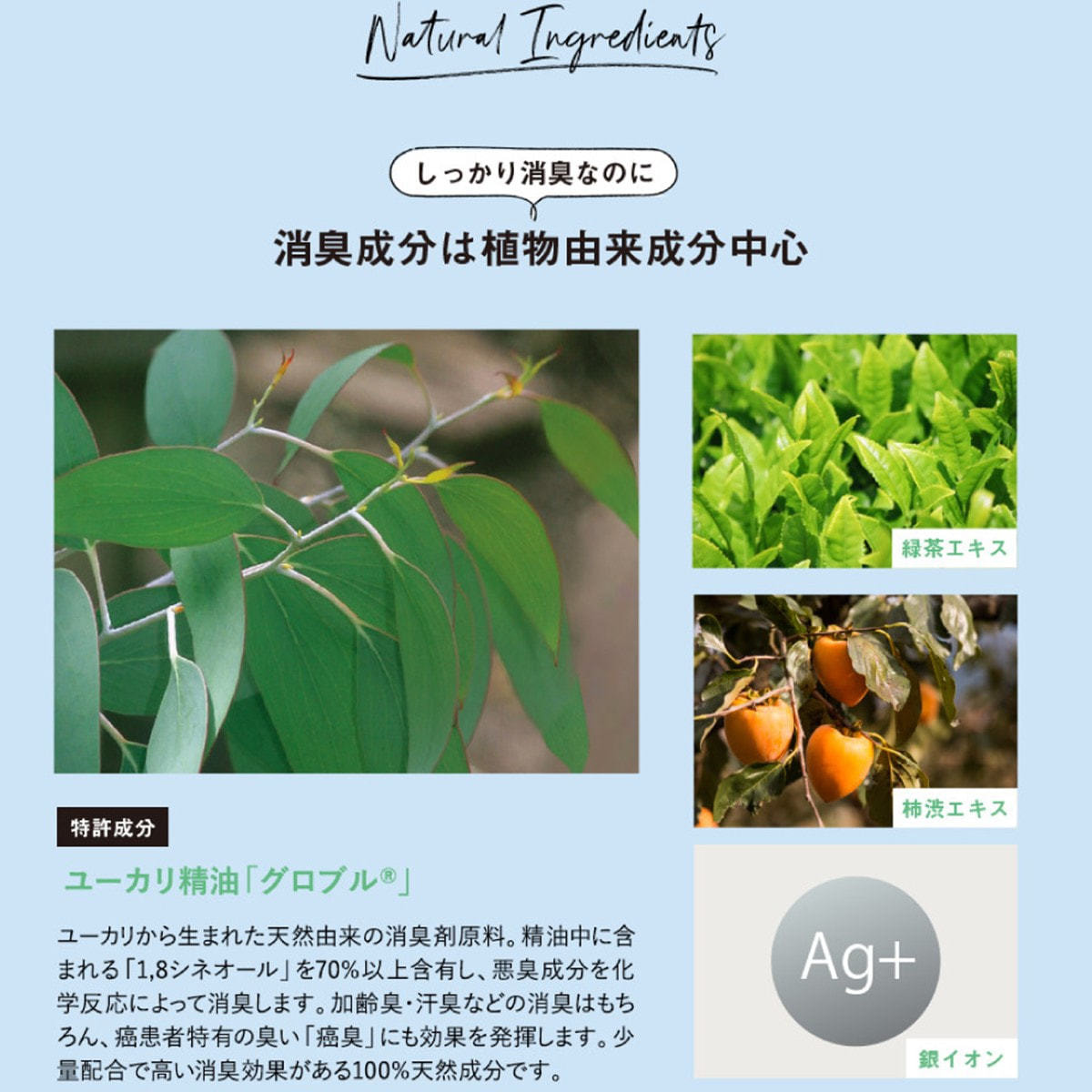 ユーカリ精油などの植物由来の消臭成分で、気になるニオイもスッキリ消臭。