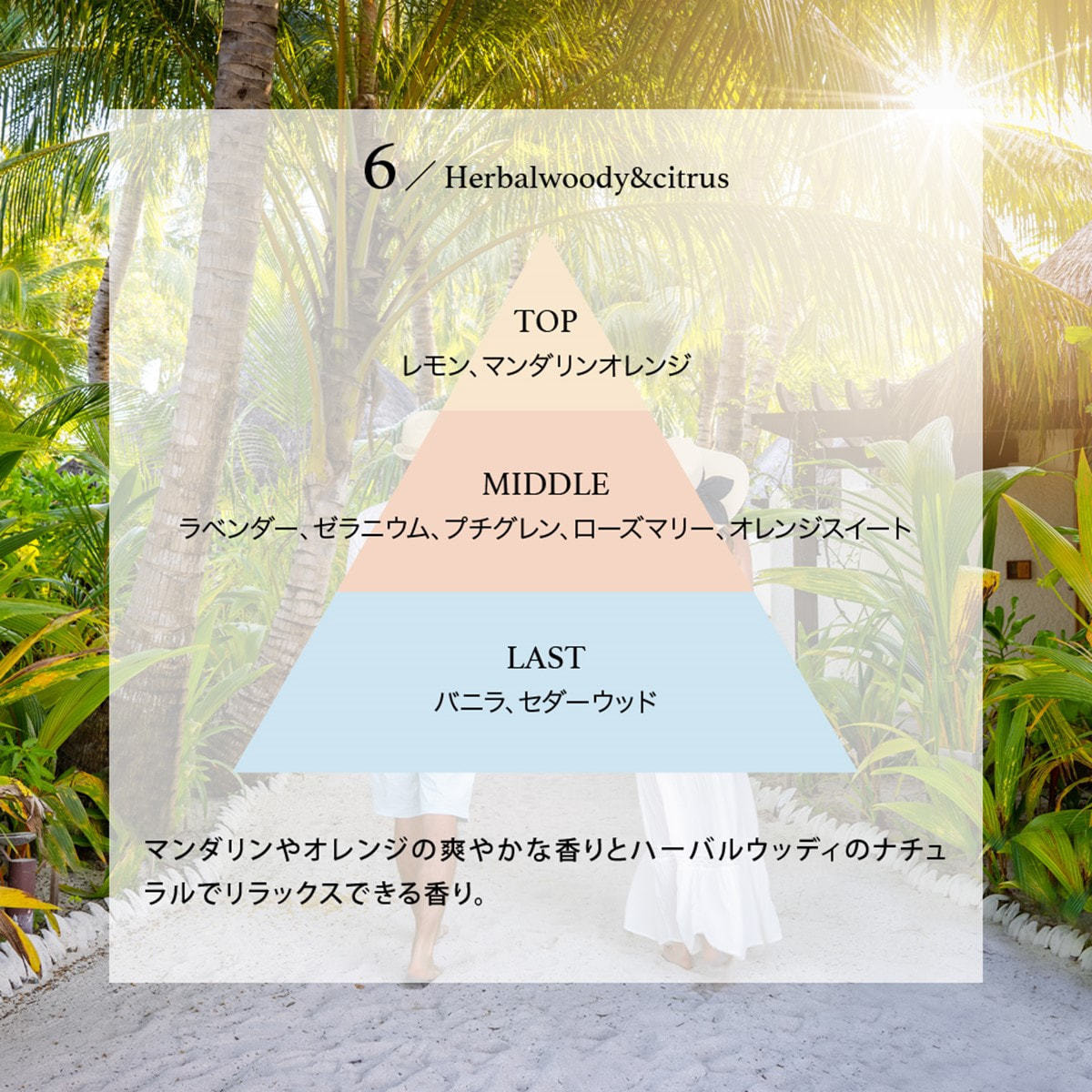 マンダリンやオレンジの爽やかな香りとハーバルウッディのナチュラルでリラックスできる香り。