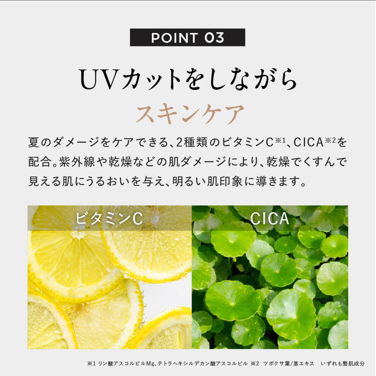 2種類のビタミンC*1とCICA*2を配合。紫外線が強くなる季節の肌荒れケアも同時にできます。