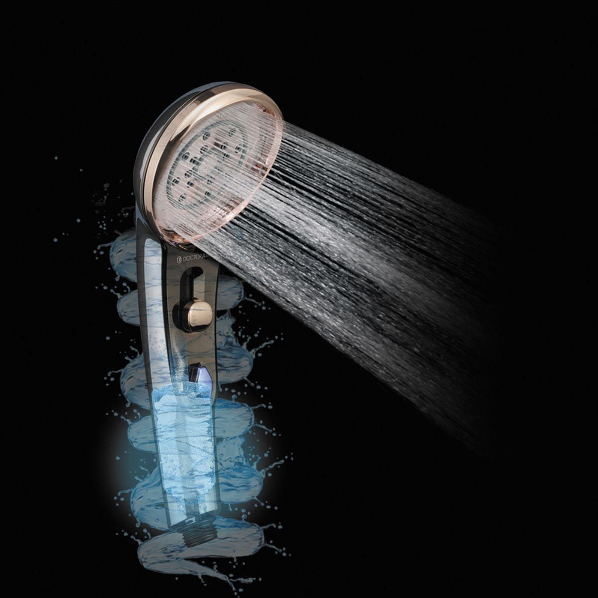 水圧を利用して特殊形状部に水がぶつかりながらトルネードのように回転し、 水路を上昇することにより、シャワーの勢いを損なうことなくナノバブルを発生させます。