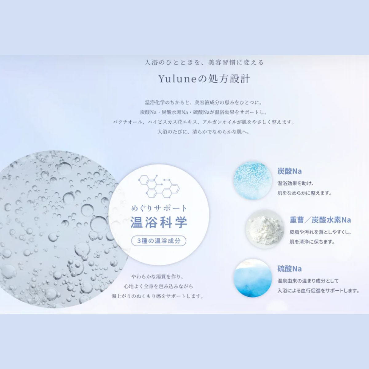 温浴科学(3種の温浴成分)でやわらかな湯質を作り、心地よく全身を包み込みながら湯上りのぬくもり感をサポート。