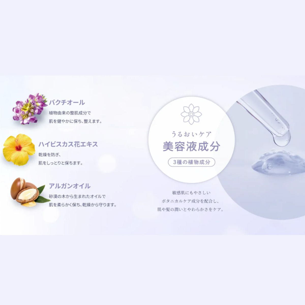 さらに美容液成分(3種の植物成分)で敏感肌にもやさしいボタニカルケア成分を配合し、肌や髪の潤いとやわらかさをケアします。